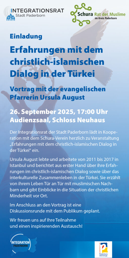 Der Integrationsrat der Stadt Paderborn lädt in Kooperation mit dem Schura-Verein herzlich zu Veranstaltung „Erfahrungen mit dem christlich-islamischen Dialog in der Türkei“ ein.